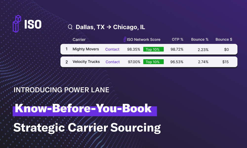 Tap into ISO's Power Lane, the capacity sourcing tool that gives you a carrier's verified service scores before you book. Source from a network of vetted carriers and access industry-wide performance KPIs for any lane, facility, and consignee.