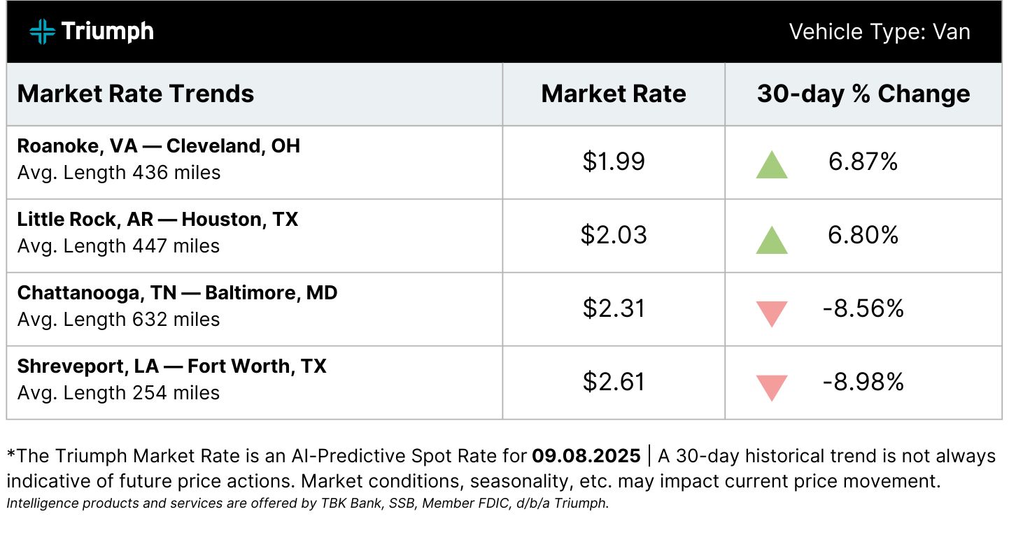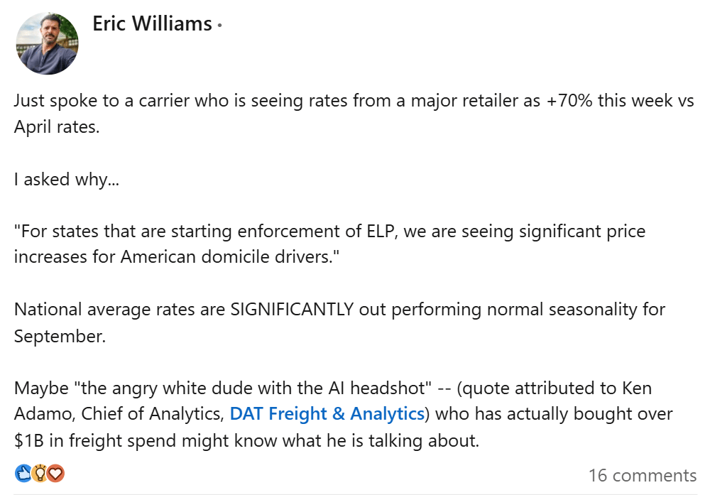 š ELP Enforcement Impact. In a LinkedIn post, Eric Williams said a carrier reported rates from a major retailer up 70% vs April in states enforcing English Language Proficiency rules, pushing September averages above seasonal norms.