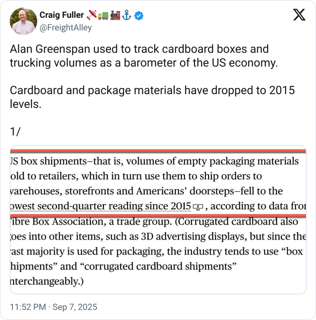 Box Numbers: Craig Fuller flagged that cardboard shipments ā a classic barometer of economic activity ā fell to their lowest Q2 reading since 2015, according to the Fibre Box Association.