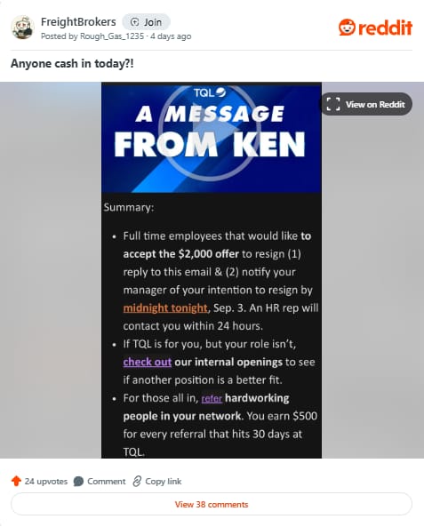 šµ TQL Offers $2,000 Resignation Incentive. Total Quality Logistics is again offering employees $2,000 to resign if they are not āall in,ā CEO Ken Oaks wrote in an internal email shared on social media. The Cincinnati-based 3PL, with $8 billion in annual sales, has used similar programs in 2015 and 2019 to filter out disengaged staff. The incentive comes amid margin pressures, digital platform competition, and industry overcapacity. Comparable offers have appeared at rivals like Steam Logistics. The offer reflects TQLās recurring strategy, seen in 2015 and 2019, of testing employee commitment in a sector defined by $8 billion in annual sales, thin margins, and intense competition from digital platforms.