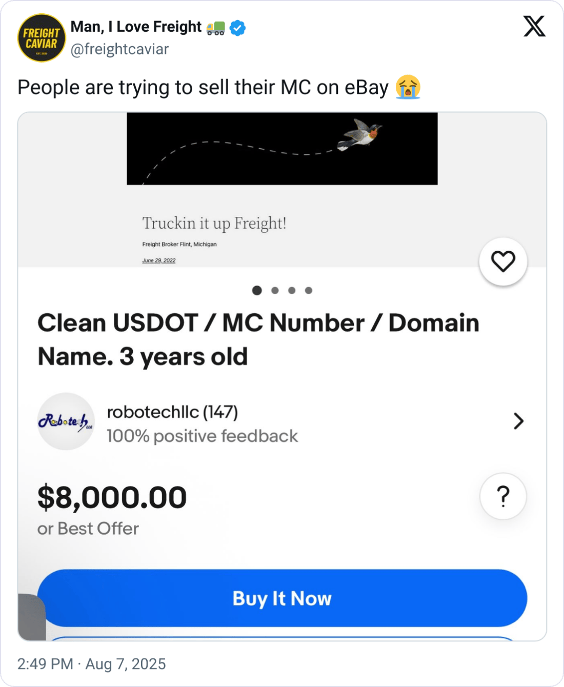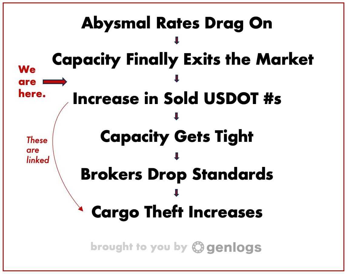 "After holding on for dear life for two years, carriers are starting to exit the market in higher numbers," Joyce told FreightCaviar. "They can make a last and quick $20K by selling their USDOT/MC numbers online. Some even hand over logins and bank account access."