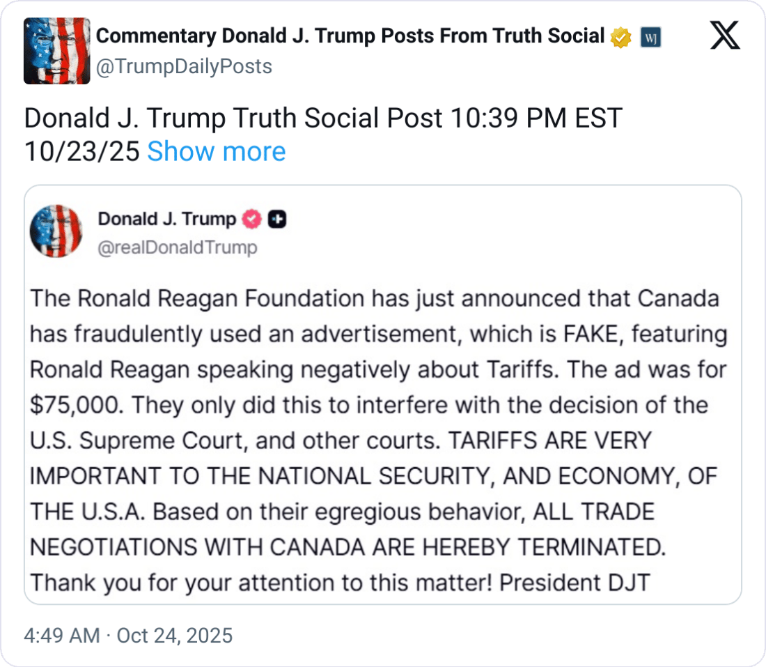 🇨🇦 Canada Trade Talks Terminated. Donald Trump announced on Oct 24 that he is ending all trade negotiations with Canada after a controversial Ontario ad used edited clips of Ronald Reagan to criticise U.S. tariffs.
