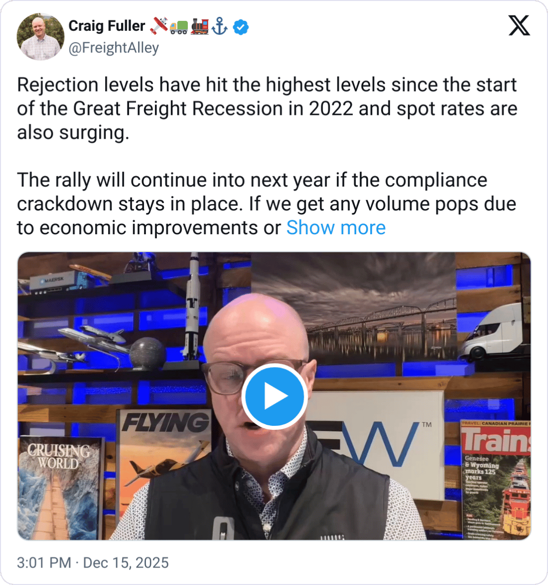 FreightWaves CEO Craig Fuller has pointed to capacity exits and compliance-driven pressure as reasons rates and rejections are responding: