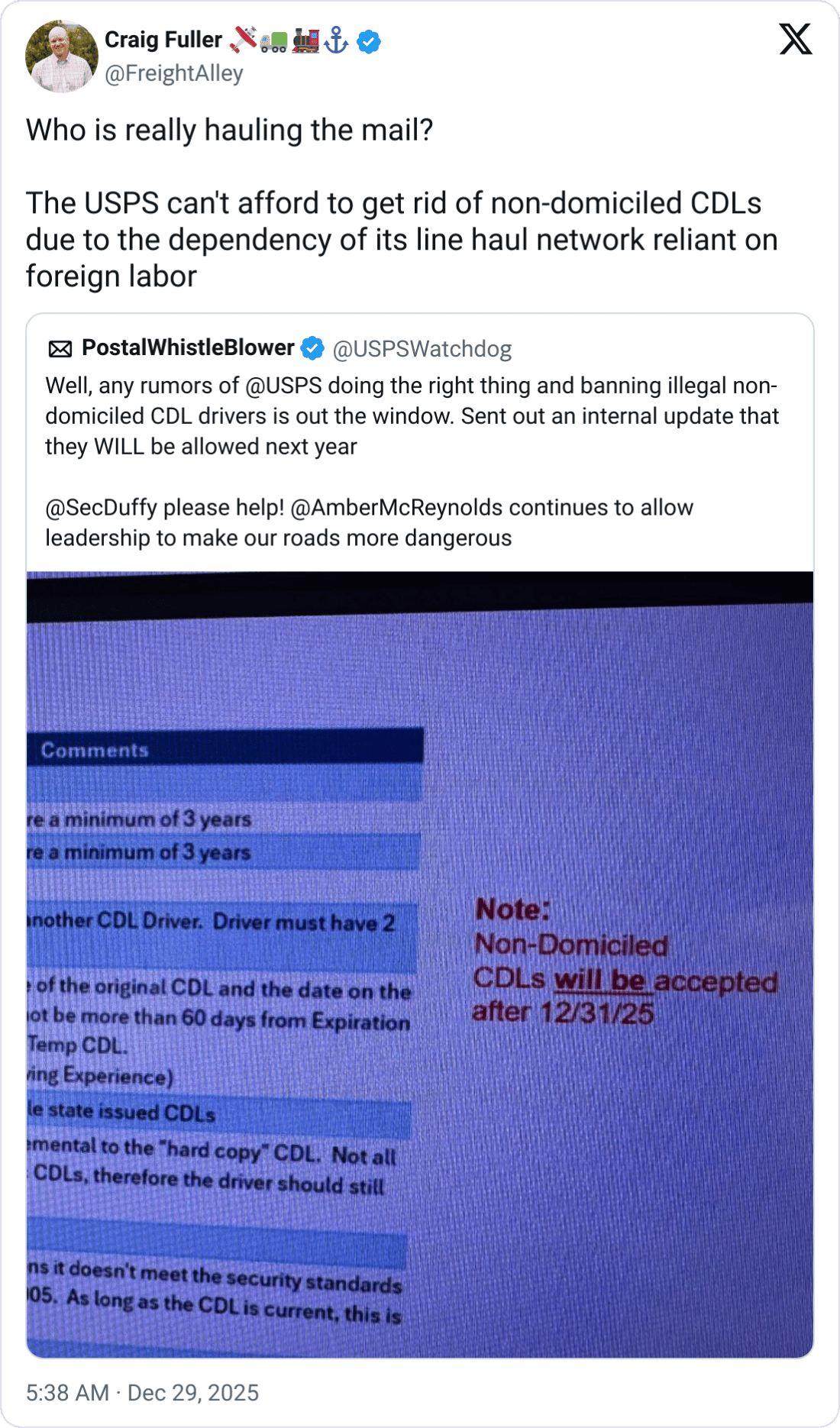 š¬ USPS Dependency. With USPS continuing to rely on non-domiciled CDL holders in 2026, questions are emerging about who will ultimately haul the mail and whether English proficiency rules will be consistently enforced.