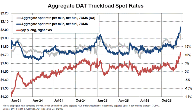 According to ACT Research, spot rates were running about 10% above year-ago levels, rising roughly 8% on a seasonally adjusted basis over the past month.