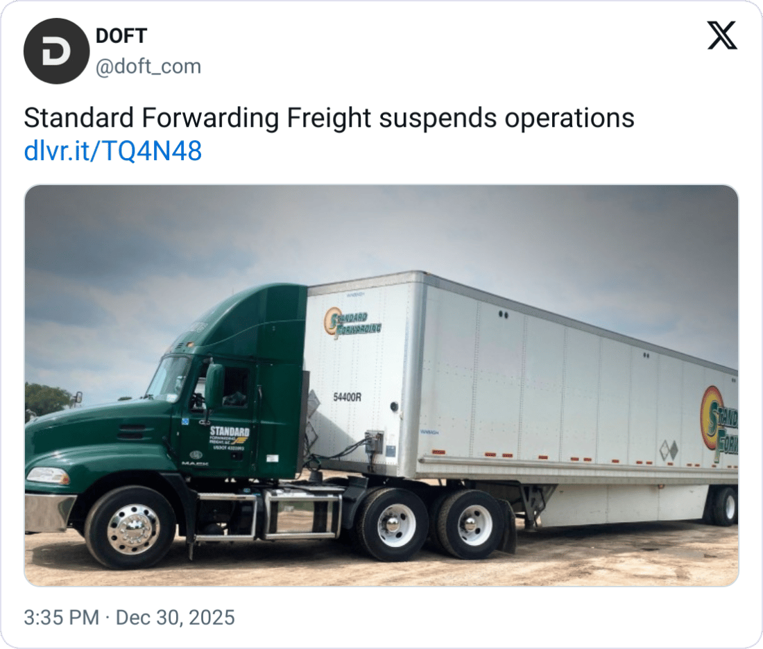 š Standard Forwarding Freight & Queen Transportation Shut Down. Two regional trucking companies abruptly halted operations during the holiday period, leaving hundreds of drivers uncertain about next steps. 91-year-old Standard Forwarding Freight announced it will temporarily suspend daily operations following a strategic review, impacting a fleet of roughly 302 trucks and 277 drivers. While the company framed the move as a pause, the Teamsters say management intends to fully shut down and are pursuing bargaining and possible legal action. Separately, Queen Transportation ceased operations over Christmas, terminating employees immediately. The carrier ran 89 trucks and remains listed as active in FMCSA records.