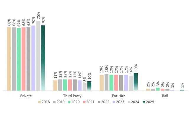 FreightWaves Analyst Thomas Wasson notes private fleets’ share slipped to 70% this year, while brokers and 3PLs held 10%. That’s a reversal from the post-COVID years when private fleets had been gaining ground, a trend that began in 2017.