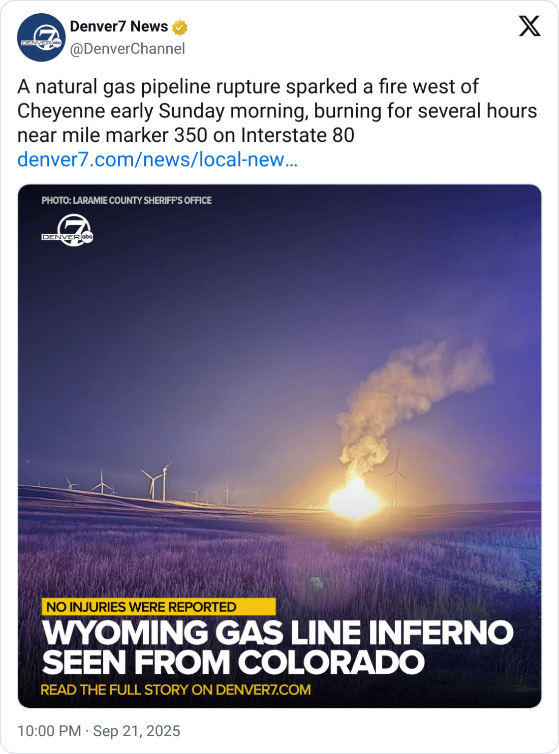 🔥 Wyoming Pipeline Blast Halts Freight Corridor. A Kinder Morgan natural gas pipeline ruptured early Sunday near Cheyenne, Wyoming, igniting next to a Union Pacific freight train and charring several cars, including ones within 40 feet of hazmat shipments. No derailments or injuries were reported, but the fire disrupted one of the busiest east–west freight corridors. The National Transportation Safety Board has launched an investigation into the cause. With rail and truck routes heavily intertwined along I-80, even short-term inspections or repairs could slow traffic.