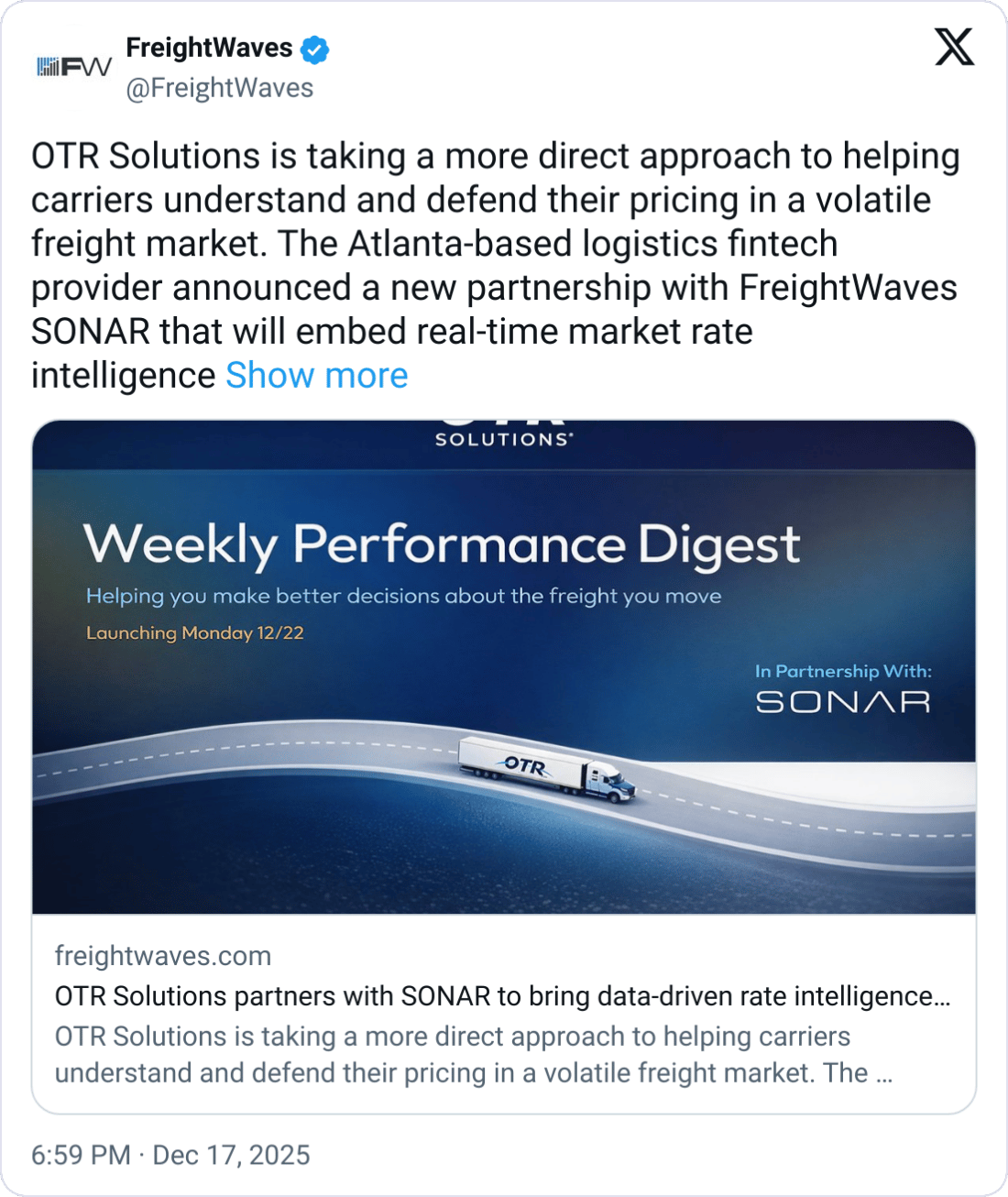 š Rate Intelligence. OTR Solutions has partnered with SONAR to deliver data-driven freight rate insights, giving brokers and carriers clearer market visibility and pricing signals.
