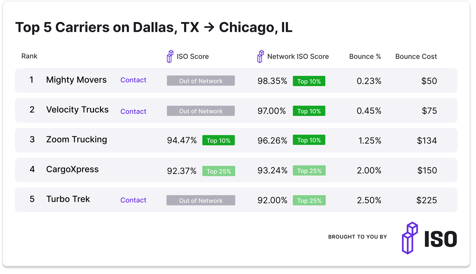 Find vetted carriers based on historical OTP, OTD, Bounce Rates, and ISO Score.
