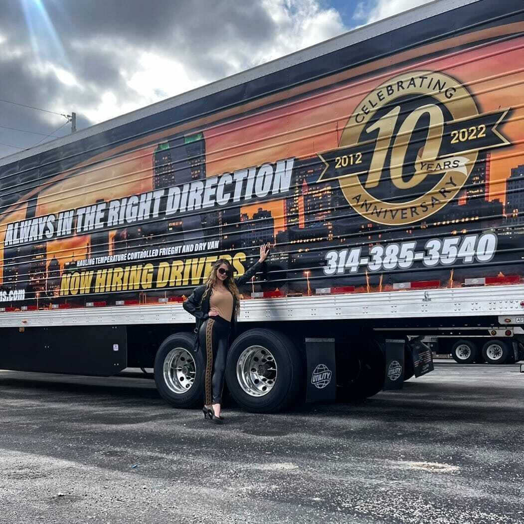Angie's Transportation CEO Angelina (Angie) Twardawa poses with one of the company's trucks. Image Source: Angie Twardawa/Instagram