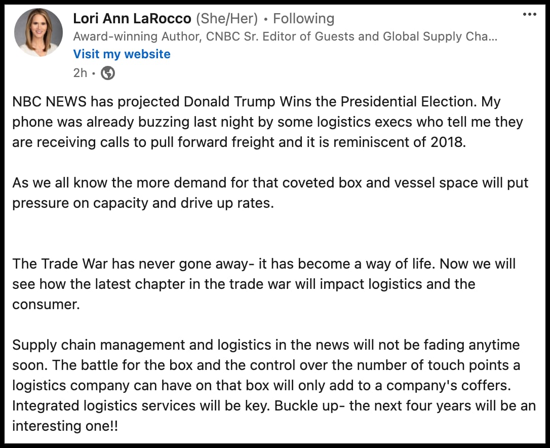 Trumpās win has logistics execs bracing for a capacity crunch. Lori Ann LaRocco: āIntegrated services will be key in the next four years.ā Image Source: LinkedIn/Lori Ann LaRocco.