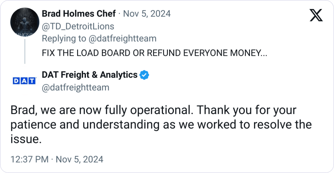 š¤ DAT Outage Frustrates Customers. DAT experienced a downtime yesterday for several hours, leading to significant frustration and anger among its users.