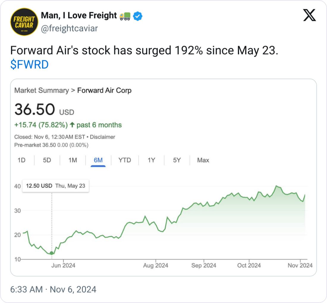 š Forward Air's Stock Up 192% Since May 23rd. Forward Airās revenue jumped to $655.9 million in Q3, up 92% thanks to the Omni Logistics acquisition, though integration costs led to a $34.2 million net loss. CEO Shawn Stewart confirmed Omniās integration is nearly complete, allowing Forward Air to focus on expanding its global freight services. The company is streamlining IT and operations, with a new Miami hub supporting Latin American routes. Since May 23rd, Forward Airās stock has surged 192%, climbing from $12.50 to $36.50.