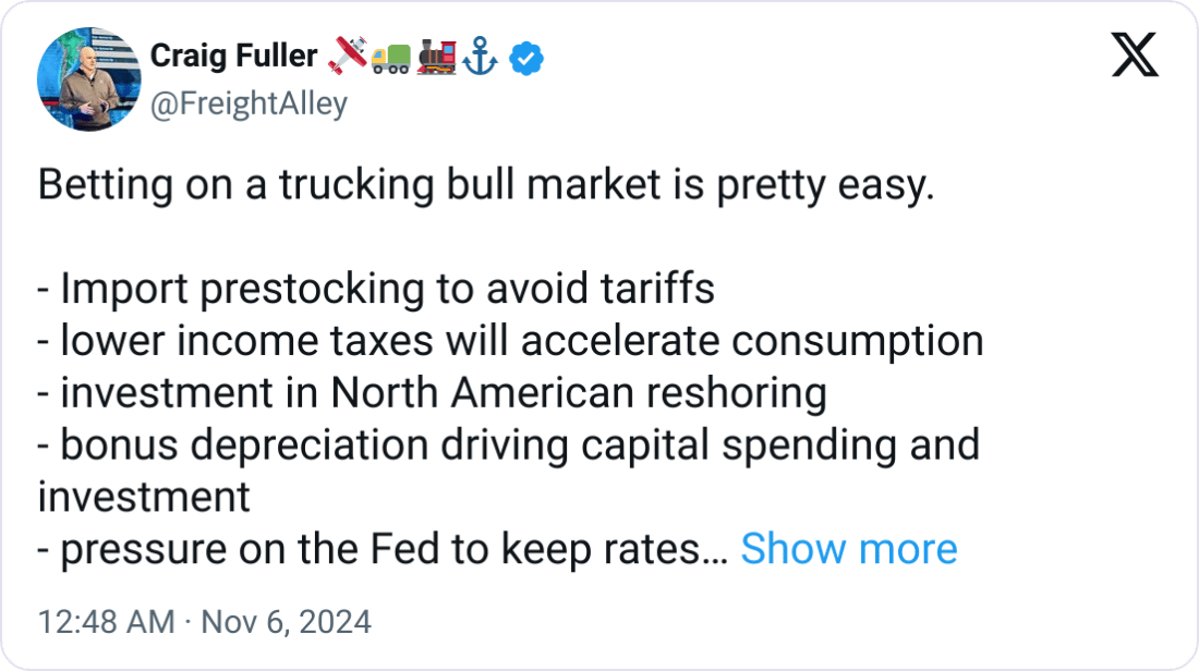 Fuller is optimistic, tweeting that Trump's policiesālike import prestocking to dodge tariffs and lower income taxes to spur consumptionācould fuel a trucking bull market.