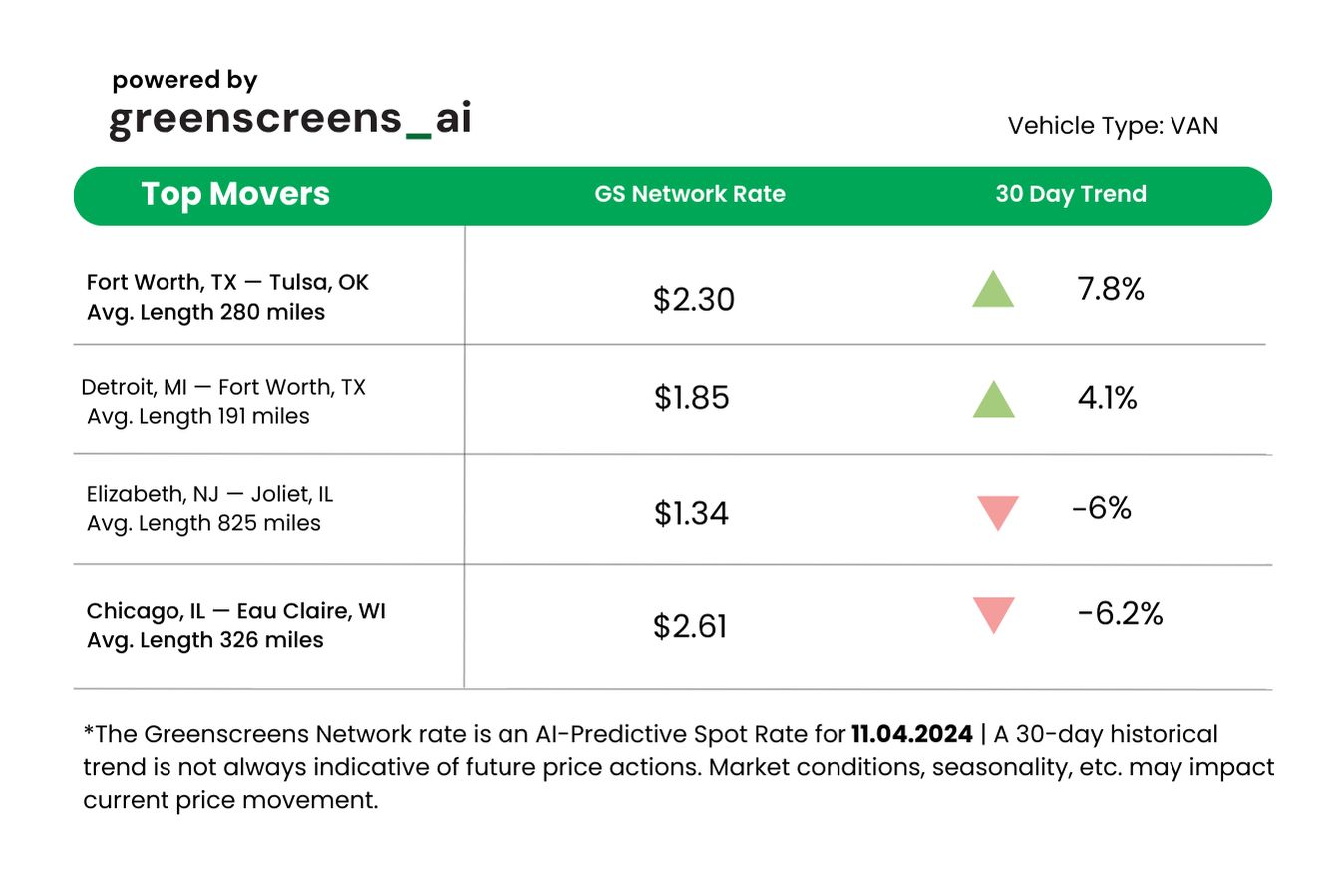 *Greenscreens.ai, forecasts real-time truckload buy prices that are suited to each freight brokerage's purchasing power using AI and machine learning. Its engine takes into account over 130 attributes and data points in each rate forecast.