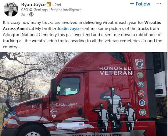 Ryan Joyce, CEO of GenLogs, shared that after seeing photos from Arlington National Cemetery, he began tracking the wreath-laden trucks moving across the U.S.