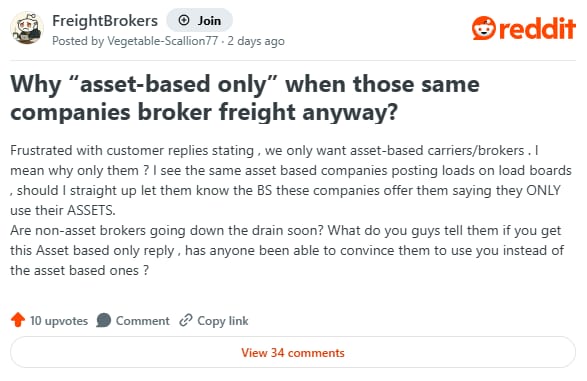 A broker on r/FreightBrokers this week questioned why so many shippers insist on “asset-based only” partners, even as those same companies routinely broker freight themselves. The broker asked whether non-asset brokers are being pushed out and if there’s any way to overcome that objection.